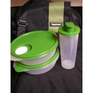 What we do today matters tomorrow. Save money while preserving the environment from disposable alternatives with reusable Tupperware products. His Tupperware Lunch Set: Large Lunch Bag features insulated interior, outside zipper pocket, front flap, and adjustable shoulder strap. Set includes one 16 oz. Tumbler with virtually liquid-tight seal and flip-top spout, & 2 Crystal Wave 4 1/4 cup containers. Bag is Black and Green with Tupperware Logo.